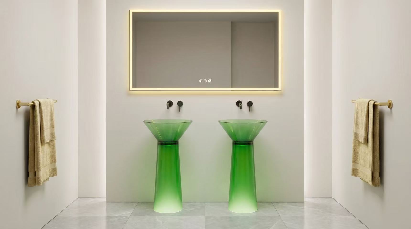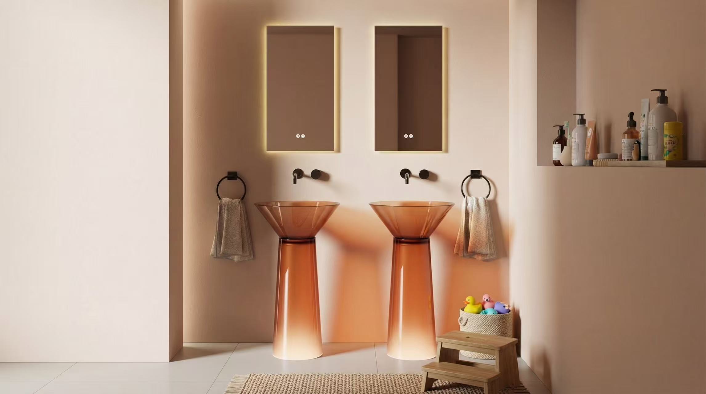 An artificial stone pedestal basin with storage space combines the functionality of a sink with the practicality of storage. Open shelves can be added to the pedestal or incorporated into the design of the basin, offering easy access to frequently used items while maintaining an open and airy feel in the bathroom.