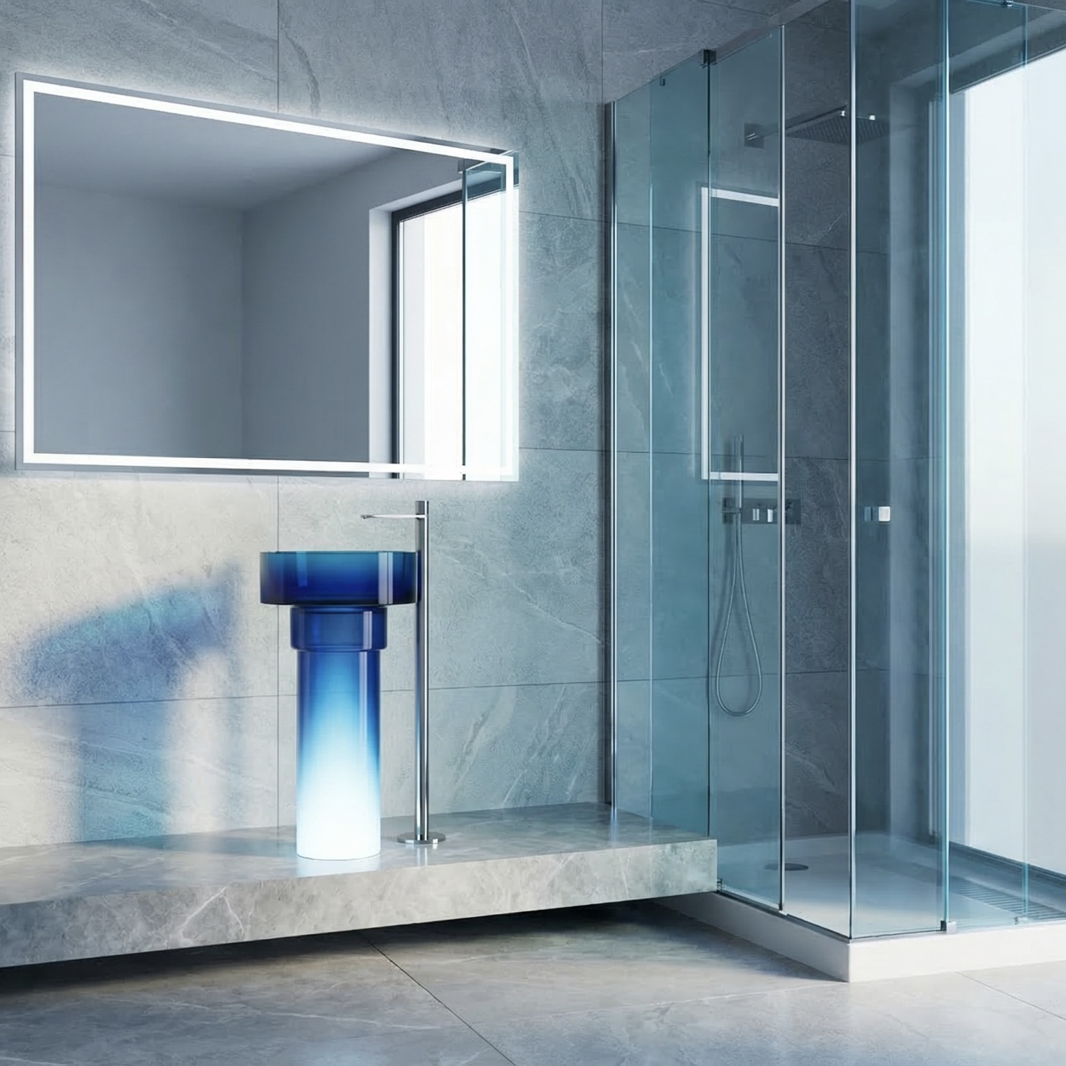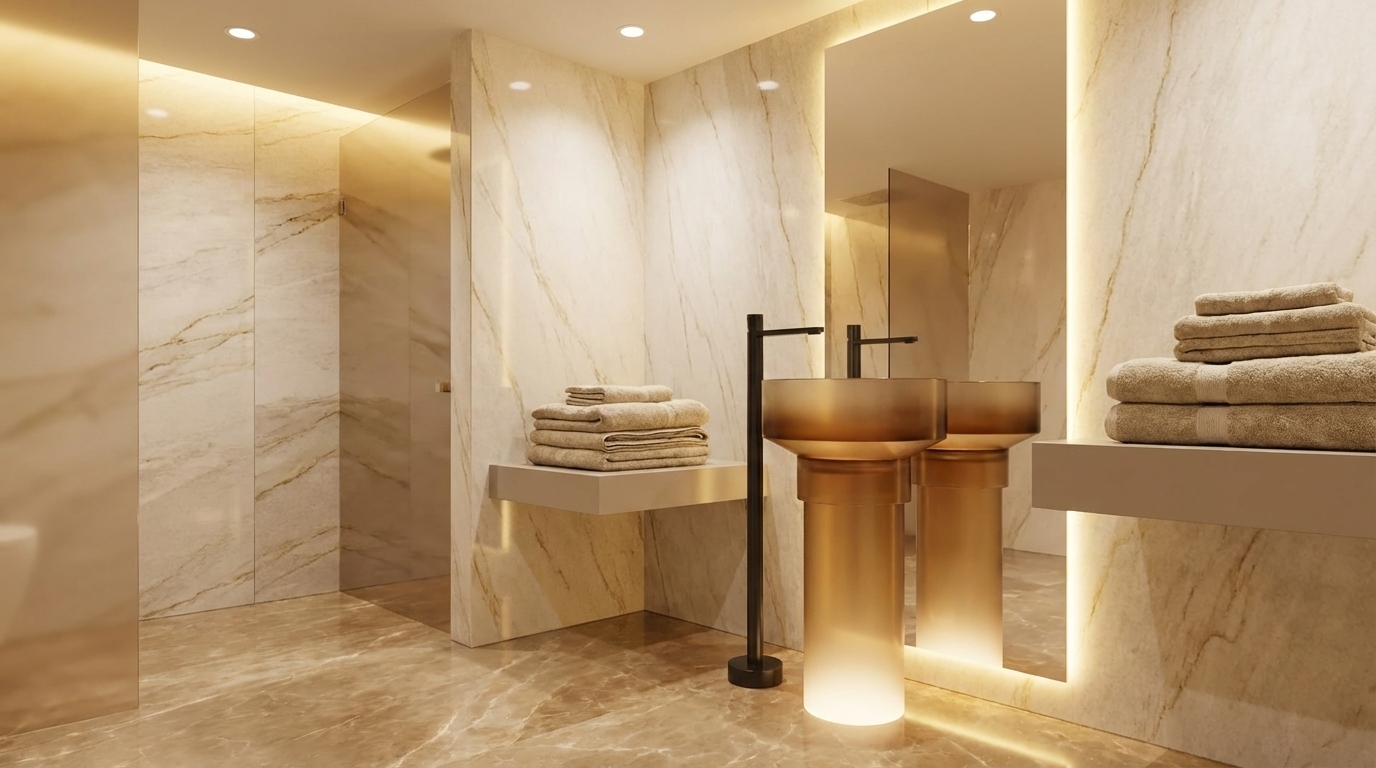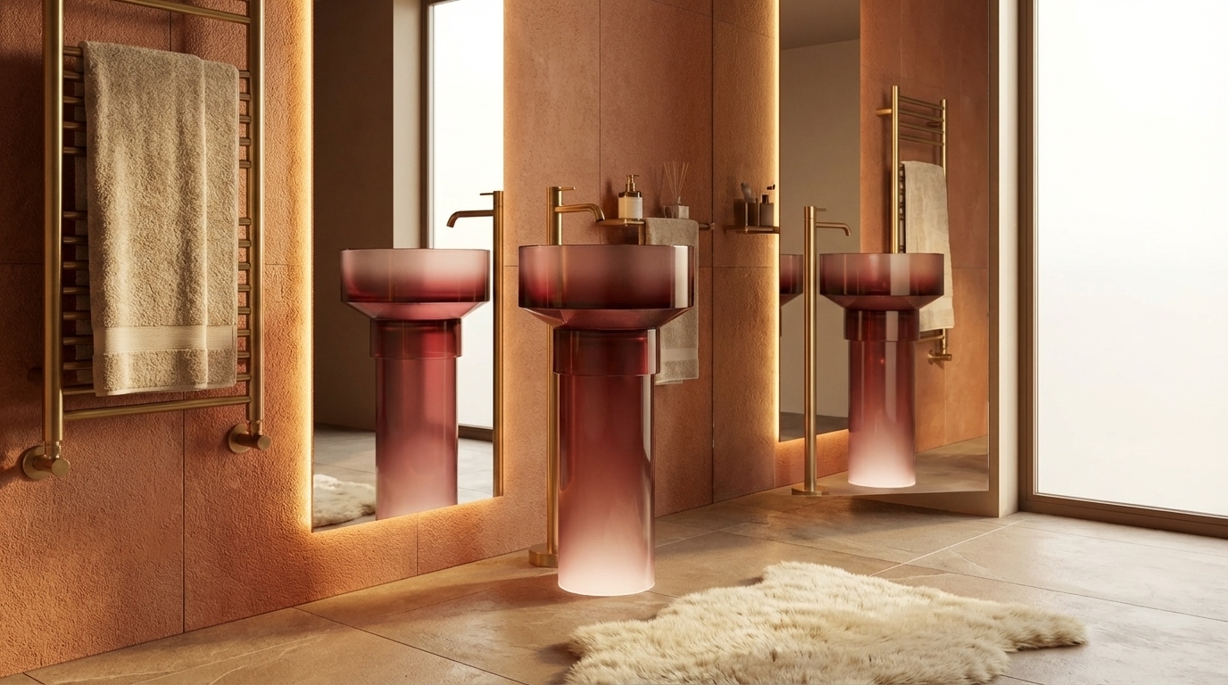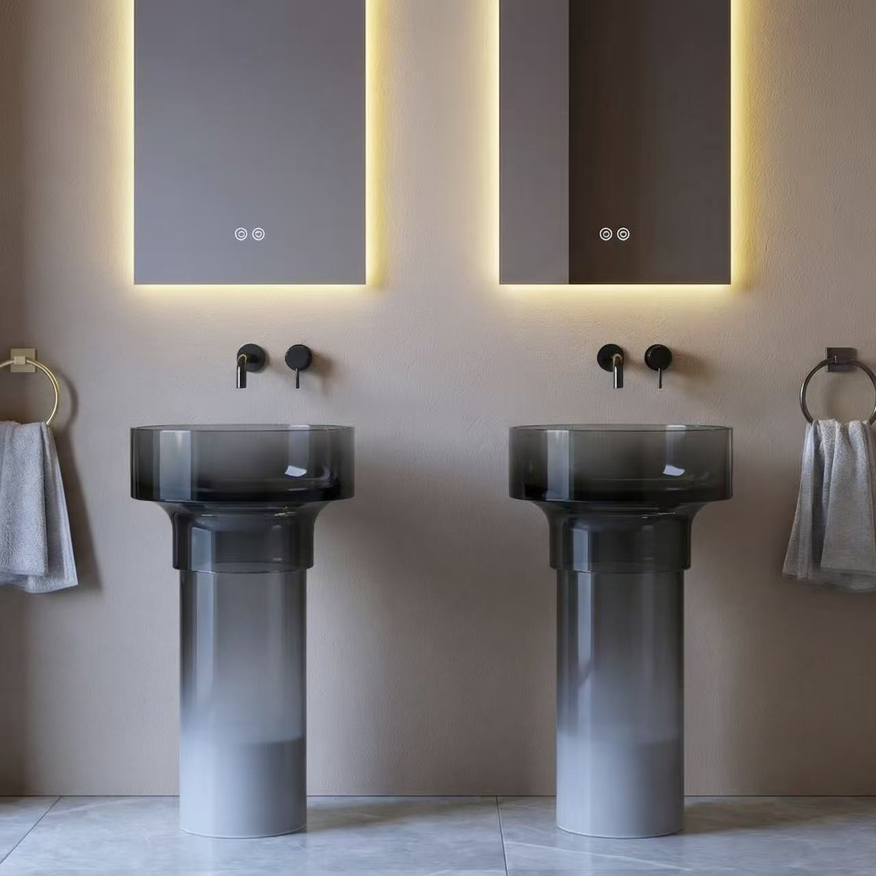 An artificial stone pedestal basin with storage space combines the functionality of a sink with the practicality of storage. Open shelves can be added to the pedestal or incorporated into the design of the basin, offering easy access to frequently used items while maintaining an open and airy feel in the bathroom.
