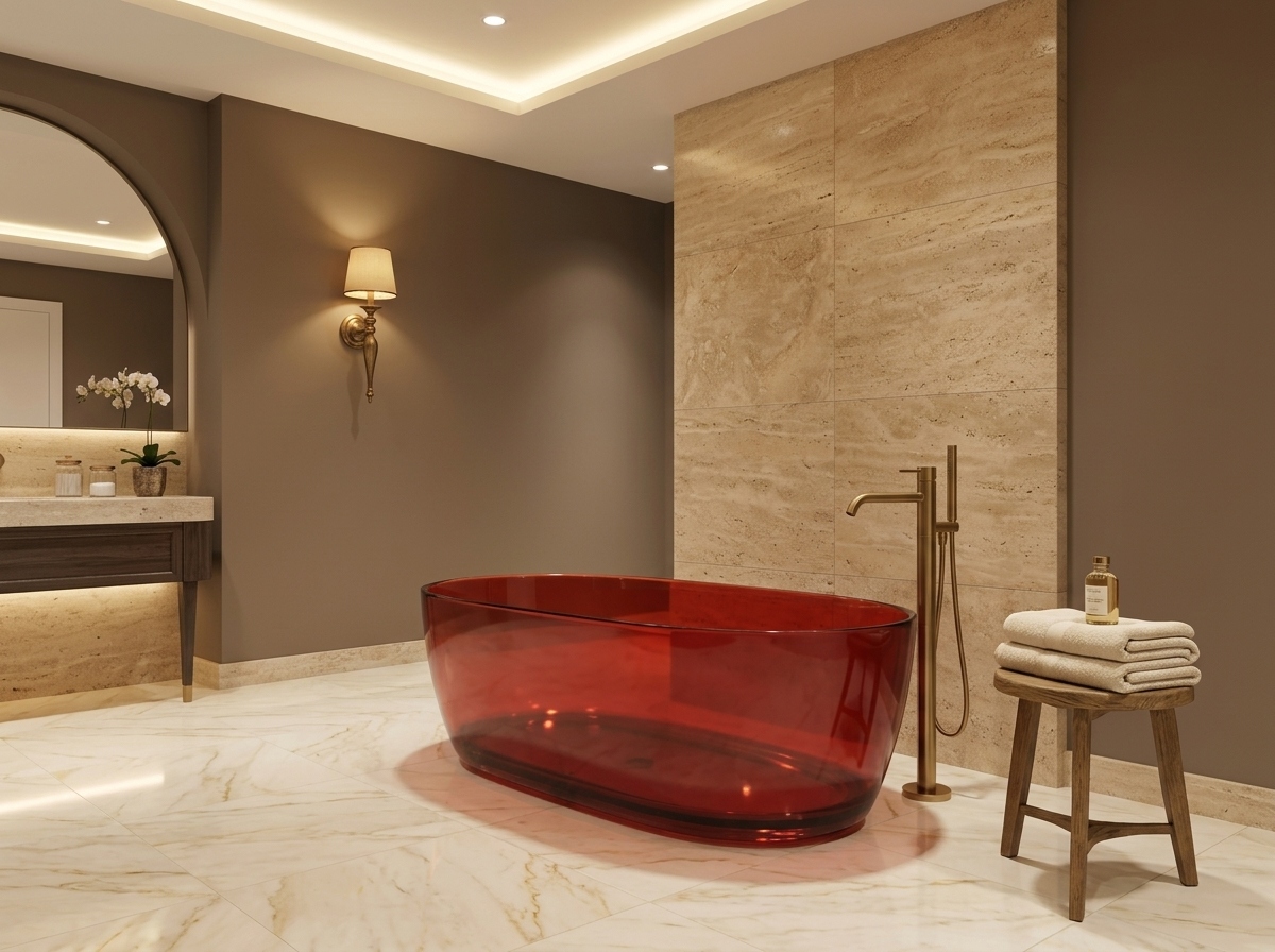 A red artificial stone freestanding bathtub offers a bold and eye-catching focal point for a bathroom, adding a touch of vibrancy and personality to the bathroom space. It is an excellent choice for those who want to make a unique.