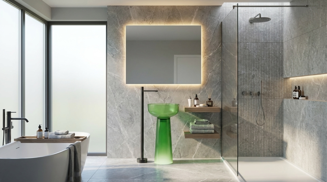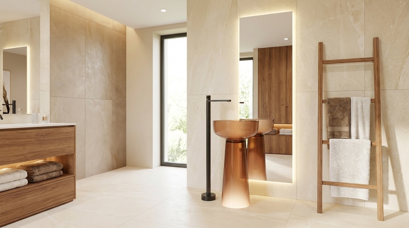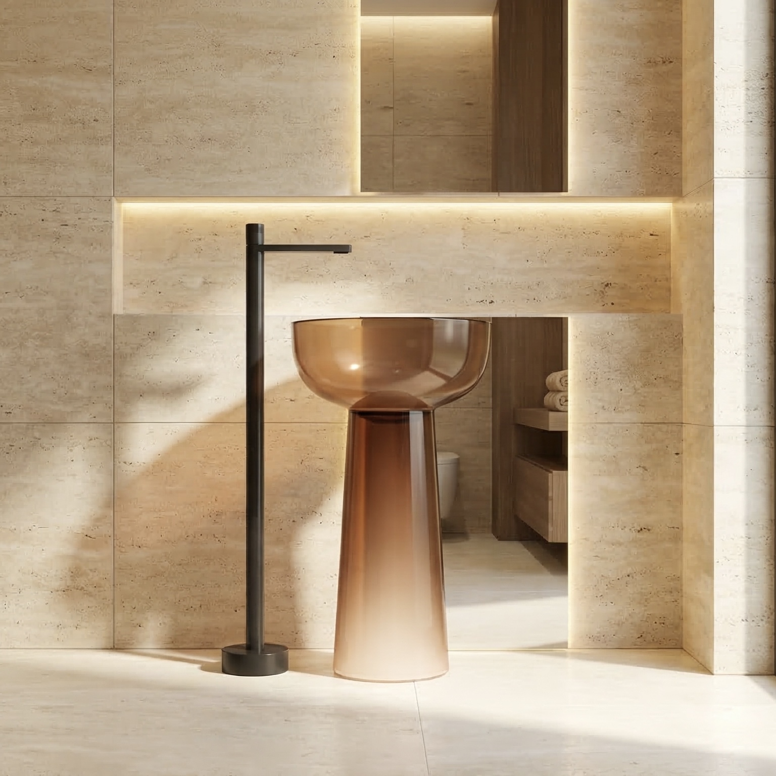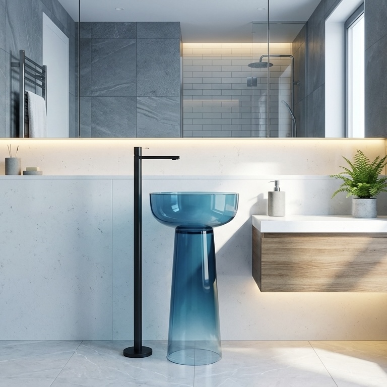 An artificial stone pedestal basin with storage space combines the functionality of a sink with the practicality of storage. Open shelves can be added to the pedestal or incorporated into the design of the basin, offering easy access to frequently used items while maintaining an open and airy feel in the bathroom.