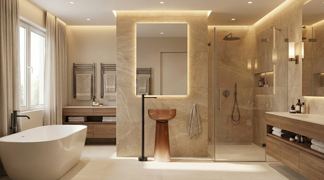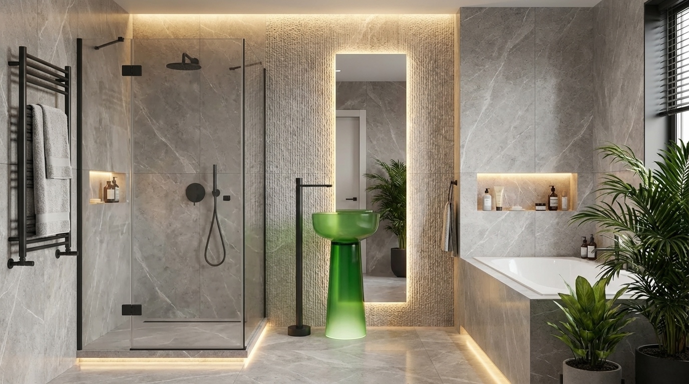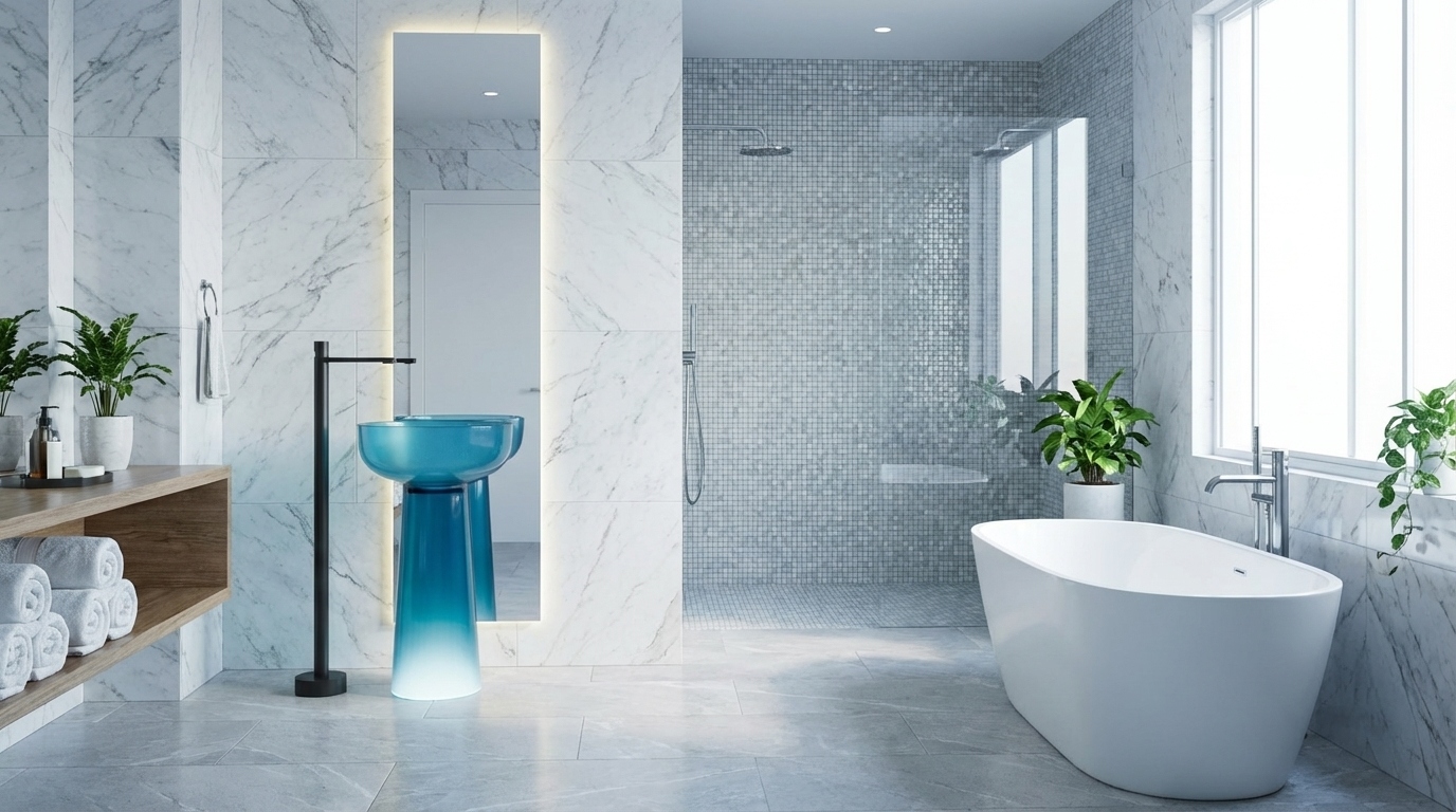 An artificial stone pedestal basin with storage space combines the functionality of a sink with the practicality of storage. Open shelves can be added to the pedestal or incorporated into the design of the basin, offering easy access to frequently used items while maintaining an open and airy feel in the bathroom.