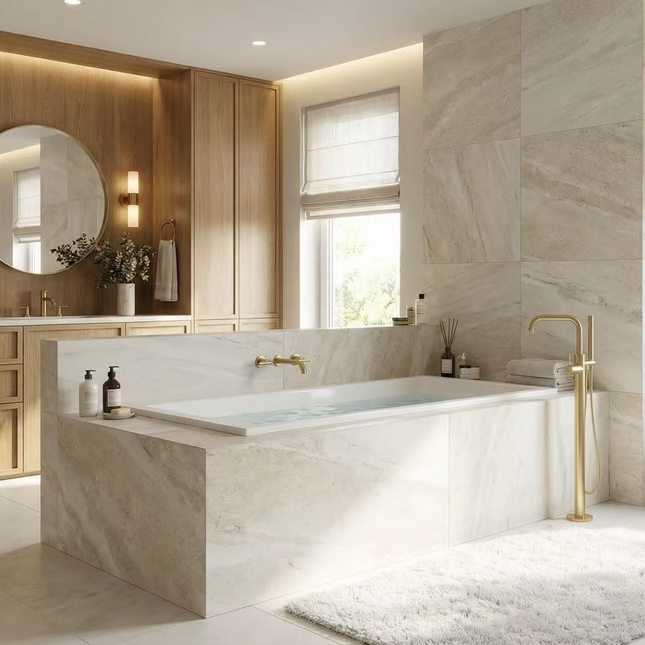 A square built-in bathtub is often chosen for its modern and minimalist aesthetic, fitting well into contemporary bathroom designs.