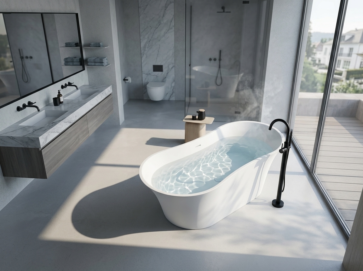 A classic white freestanding artificial stone bathtub features clean lines and a sleek design that complements various bathroom styles, from modern to traditional.