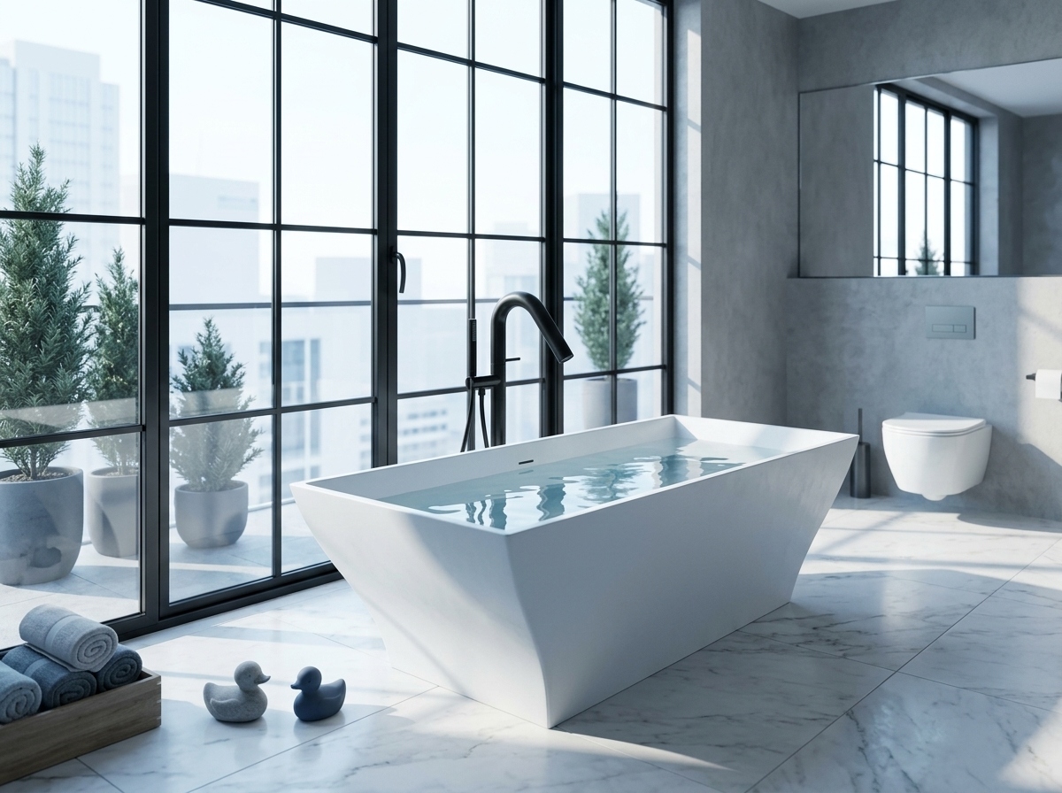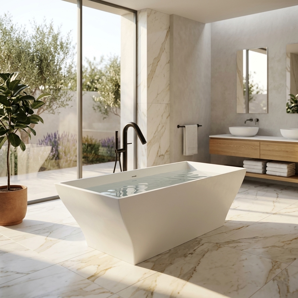 A classic white freestanding artificial stone bathtub features clean lines and a sleek design that complements various bathroom styles, from modern to traditional.