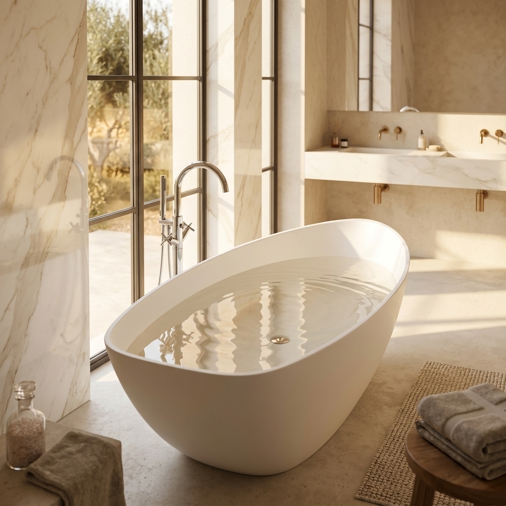 The exquisite-shaped freestanding artificial stone bathtub combines artistic design, quality craftsmanship, and functionality and can be flexibly placed in the space, becoming a stunning focal point in the bathroom, enhancing the overall ambiance and providing a luxurious bathing experience.